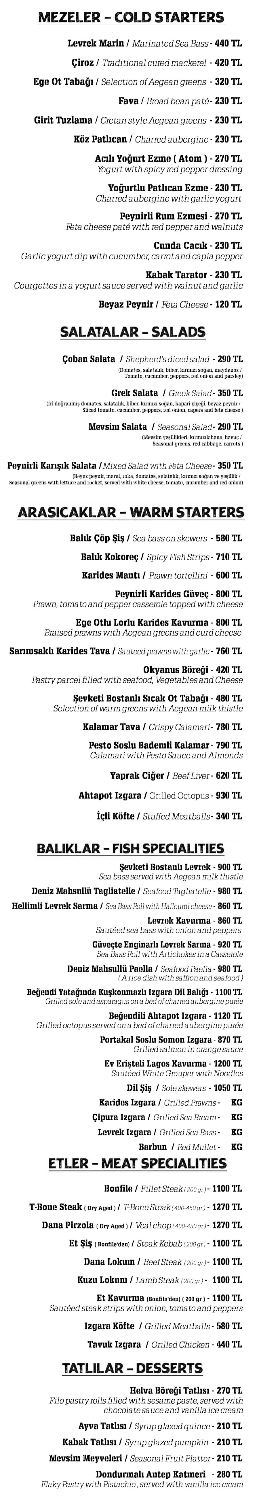 Kendisine özgü Ege, Akdeniz ve Girit Mutfağına özel A’La Carte deniz mahsülleri, özel etleri ve günlük taze balık çeşitleri ile Alsancak’da, seçkin organizasyonlarınızda en mükemmel hizmeti vermek amacıyla siz değerli misafirlerimizi bekliyoruz.